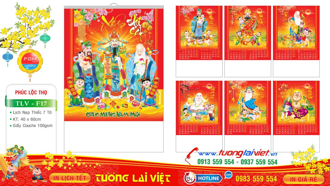 Lịch 7 tờ nẹp thiếc thường được in Offset 1 mặt trên giấy C105gsm, có kích thước: 36×70 và 45x70cm. Lịch 7 tờ Phúc lộc thọ là mẫu lịch tờ treo tường giá rẻ nên được nhiều cửa hàng nhỏ lẻ chọn in lịch tết năm nay để làm quà tặng cuối năm cho khách hàng, bạn bè, đối tác và người thân nhân dịp năm mới.