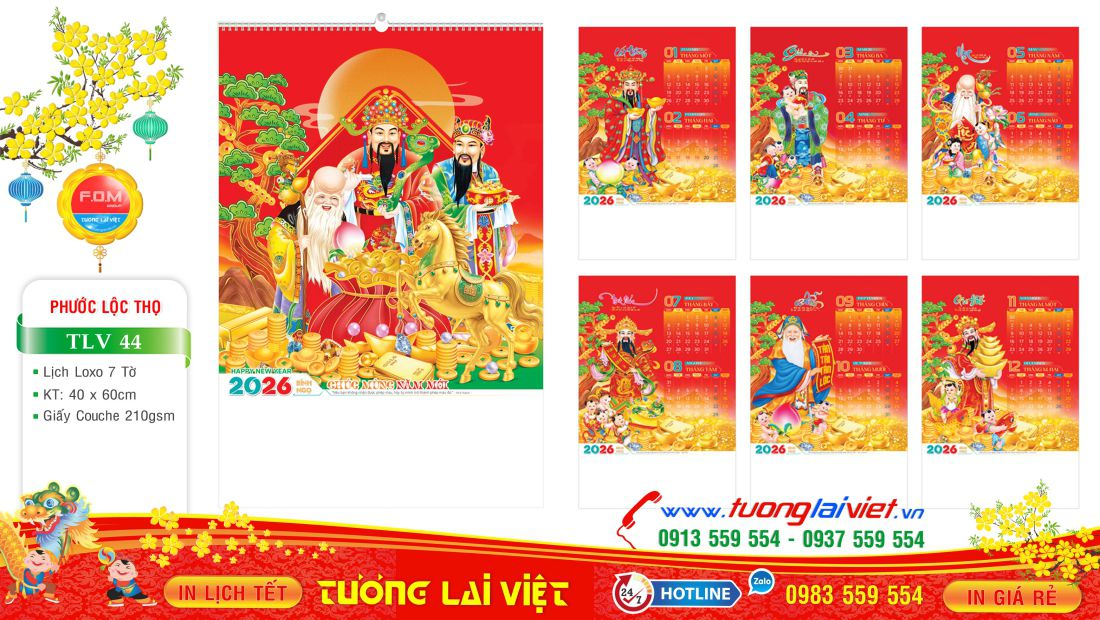 Lịch Lò Xo 7 Tờ Phúc Lộc Thọ là Mẫu lịch treo tường được nhiều đơn vị, cơ sở chọn In lịch tết làm quà tặng cho khách hàng, bạn bè, đối tác và người thân nhân dịp năm mới. In Lịch Treo Tường 7 Tờ giá rẻ với chi phí vừa phải phù hợp với các đơn vị, cơ sở nhỏ lẻ như: Tiệm Tạp Hoá, Cửa hàng Gas, Cửa hàng Gạo, Cửa hàng Bánh Kẹo, Cửa hàng Xăng Dầu, Cửa hàng Vật Liệu Xây Dựng, …